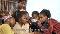 | 有害な伝統的慣習に対する人々の意識を高めようと、自身の経験に基づき一分間のビデオを制作するため、研修を受けるエチオピア人の14歳の少女、イエメセラチさん(右端)。 |