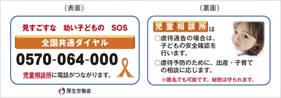 厚生労働省は、今年の「児童虐待防止推進月間」に合わせ、「児童相談所全国共通ダイヤル紹介カード」の作成や、児童委員自己紹介用名刺型リーフレットの作成・配布の取り組みを行っています。