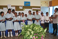 | イヴォニアさんたちがライラコ小学校の子どもたちの前で手洗いのデモンストレーションをしているところ |