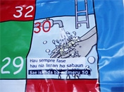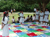 | 地域の人々も手洗いに参加 | ユニセフから送られた保健の大すごろくマット | すごろくマットで遊びながら保健の知識も学ぶことができる |
