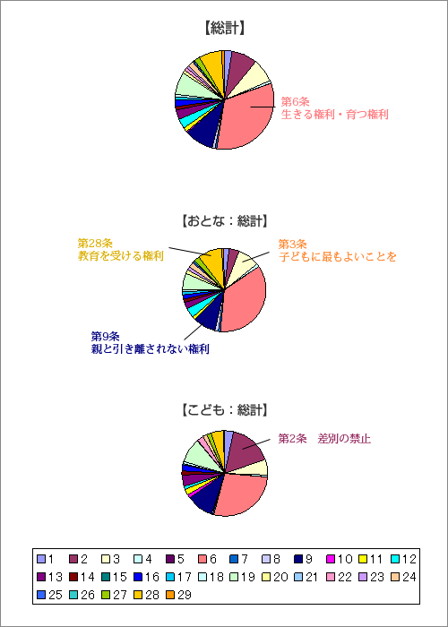 年齢や性別を問わず、最も多くの方々が選ばれた権利、それは、第6条の「生きる権利・育つ権利」でした(約33%)。