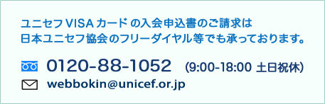 ただいま「ユニセフVISAカード」に新たにご入会いただくと、三井住友カード(株)がおひとりあたり1,000円をユニセフに寄付するキャンペーン「カードでやさしさを届ける運動」を実施しています。
