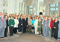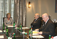| CEE/CIS地域マネージメント・チーム会合の出席者とアンソニー・レーク事務局長(中央)。(スイス・ベルンにて) | 欧州評議会事務次長のマウド・ド・ブル=ブキッキオさん、CEE/CIS地域事務所代表のスティーブン・アレンと話す、レーク事務局長。 |