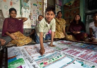 | 拡大を続けるスラムの場所を地図で示す子どもたち。このインド・コルカタのスラムで子どもたちが集めている様々な情報は、グーグル・アースにアップロードされています。 |