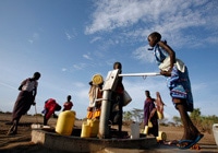 | 手押しポンプ式井戸から水を汲む女の子。まわりでは、他の子どもたちが順番を待っている。(ケニヤ) |