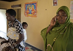 | ユニセフのイノベーションユニットによって開発されたRapidSMSは、誰でも利用できる携帯電話のメッセージ機能を使った技術で、国中の情報を集め、検索することができる。 この写真は、ルワンダの妊娠している女性のための家で、救急車を呼ぶためのメッセージを送るコミュニティの保健スタッフ。 |