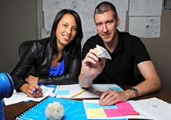 | ユニセフのイノベーションアドバイザーの古知エリカとクリストファー・ファビアンは、『タイム』誌の「世界で最も影響力のある100人」に選ばれた。彼らの前方左にあるのは、デジタル・ドラムの試作模型。 |