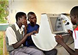 | ウガンダの若者たちが、グルにあるボスコ青少年センターでデジタル・ドラムを使っている。デジタル・ドラムは、太陽電池で動くコンピューターで、現地で手に入る材料で作られ、保健や教育に関するコンテンツがあらかじめ入っている。デジタル・ドラムは、タイム誌のベスト・イノベーション2011に選ばれた。 |