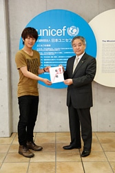 | 「溝端さん、募金は確かにお預かりしました」(早水研日本ユニセフ協会専務理事) |