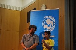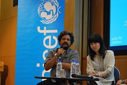 試写会に先立ち、アモール・グプテ監督をゲストにお迎えし、トークショーを行いました。聞き手として日本ユニセフ協会広報室室長の中井裕真が登壇。監督は「インドは近年、メディア業界も急速な発展をとげているが、法の整備が遅れている。リアリティショーなどで子どもが出演する中、子どもの夜間出演を規制する法律がない。こういった状況では、“児童労働”が発生していることになってしまう。この映画は“theater cinema workshop”という、休日にのみ、学業に支障のない範囲で、ワークショップ形式で行った」と、この映画の取り組みの意義を語りました。