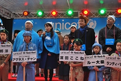 アグネス大使を始め、各界の著名人ボランティアゲストである各界の著名人の皆様がステージに登壇しました。世界では、貧困による栄養不良で年間約300万人の子どもが命を落としていること。乳幼児期のなかでも身体や脳の基礎がつくられるこの大切な1000日に、母子に必要な栄養やケアが行き届けば、助かる命がたくさんあることなどを、アグネス・チャン日本ユニセフ協会大使をはじめ、ボランティアゲストの皆様が訴えました。 そして、アグネス大使が、子どもたちと一緒に募金活動開始の宣誓をし、募金活動開始!