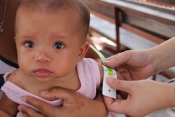 | 避難所で栄養状態のチェックを受けるフィリピンで被災したこども |