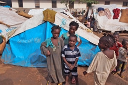 | 中央アフリカにある避難所で、ユニセフの支援したテントの前に立つ子どもたち |