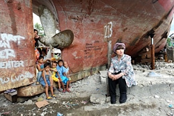 | 台風30号で陸に打ち上げられた船を背に、被災地を見つめる黒柳大使 |