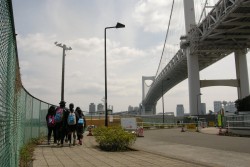 レインボーブリッジのたもとを歩く参加者の皆さん。 |