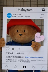 ユニセフハウスのSNSパネルで記念撮影するパディントン・ベア。毎年、ラブウォーク中央大会の応援に駆け付けてくれます。 |
