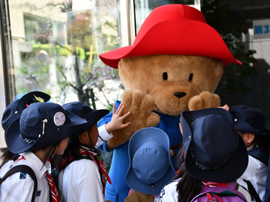 ユニセフハウスの前では、到着した子どもたちをパディントンが出迎えました。 |