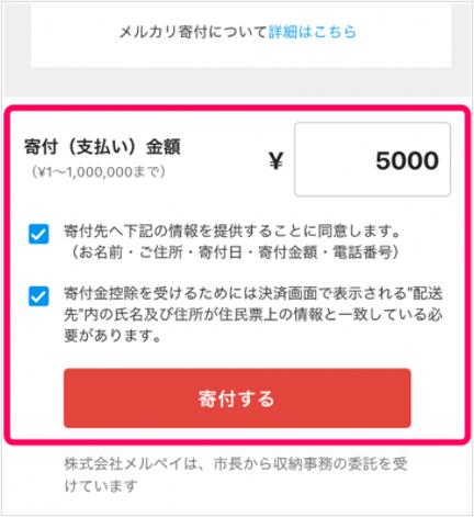 2. 寄付金額を入力し、寄付先への氏名/住所情報の共有を許可します。