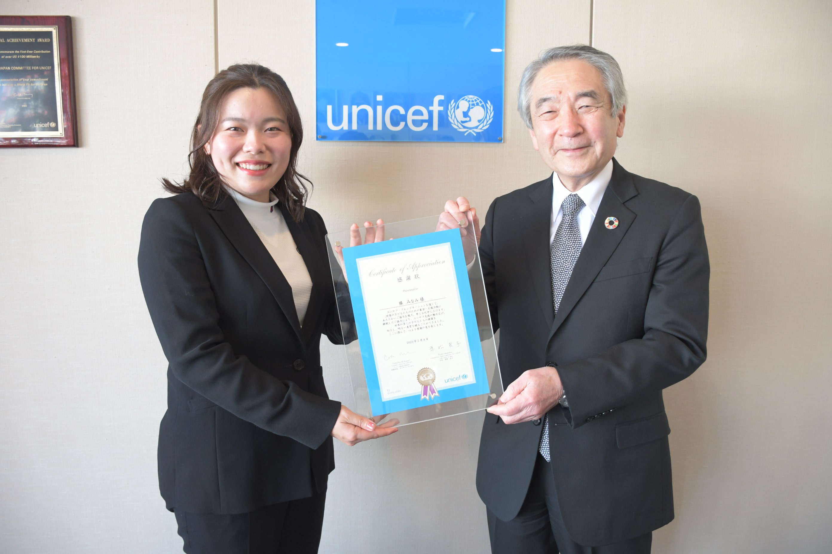 また、5年にわたるフレンドネーションへのご協力に対し、日本ユニセフ協会 早水研専務理事より感謝状が贈呈されました。今年も引き続きフレンドネーションを通じたユニセフへのご協力を予定されています。
