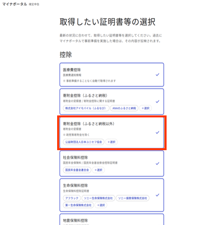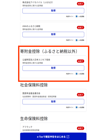 5)「寄付金控除(ふるさと納税以外)」から「公益財団法人日本ユニセフ協会」で「取得」を選択する