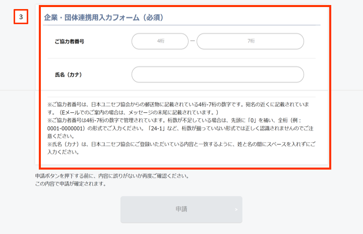 ご本人様確認のため、上記フォームでご協力者番号(4桁-7桁の数字)をご入力いただく必要がございます。ご協力者番号は、当協会からの郵送物やメール配信の際に記載されている数字です。表記例はこちらをご確認ください。
