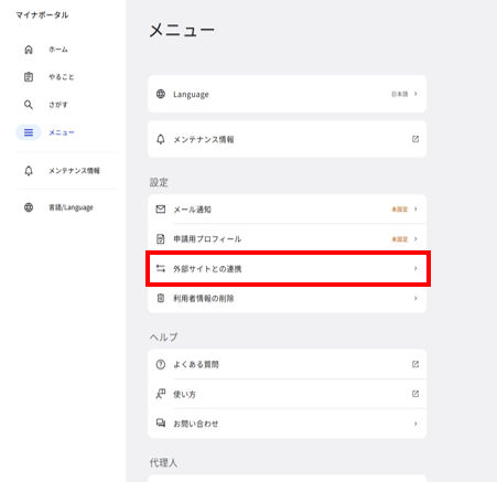 1)マイナポータルのメニューから「外部サイトとの連携」を選択する