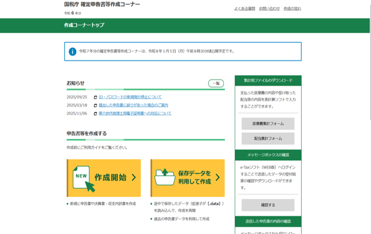 1)国税庁の「確定申告書等作成コーナー」へアクセスし、「作成開始」からお進みください。画面の案内に沿ってお進みいただくと、そのままオンライン上で確定申告書の提出まで行えます。