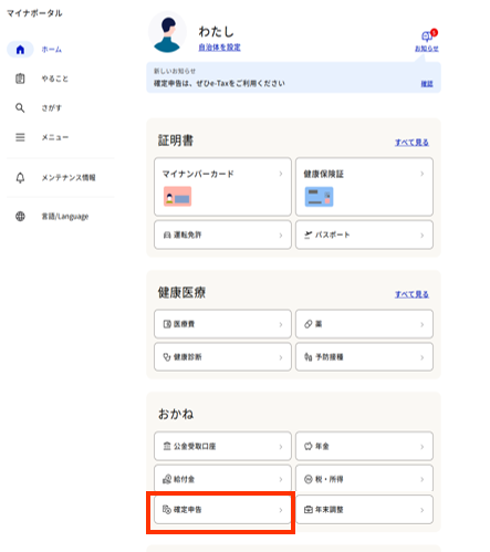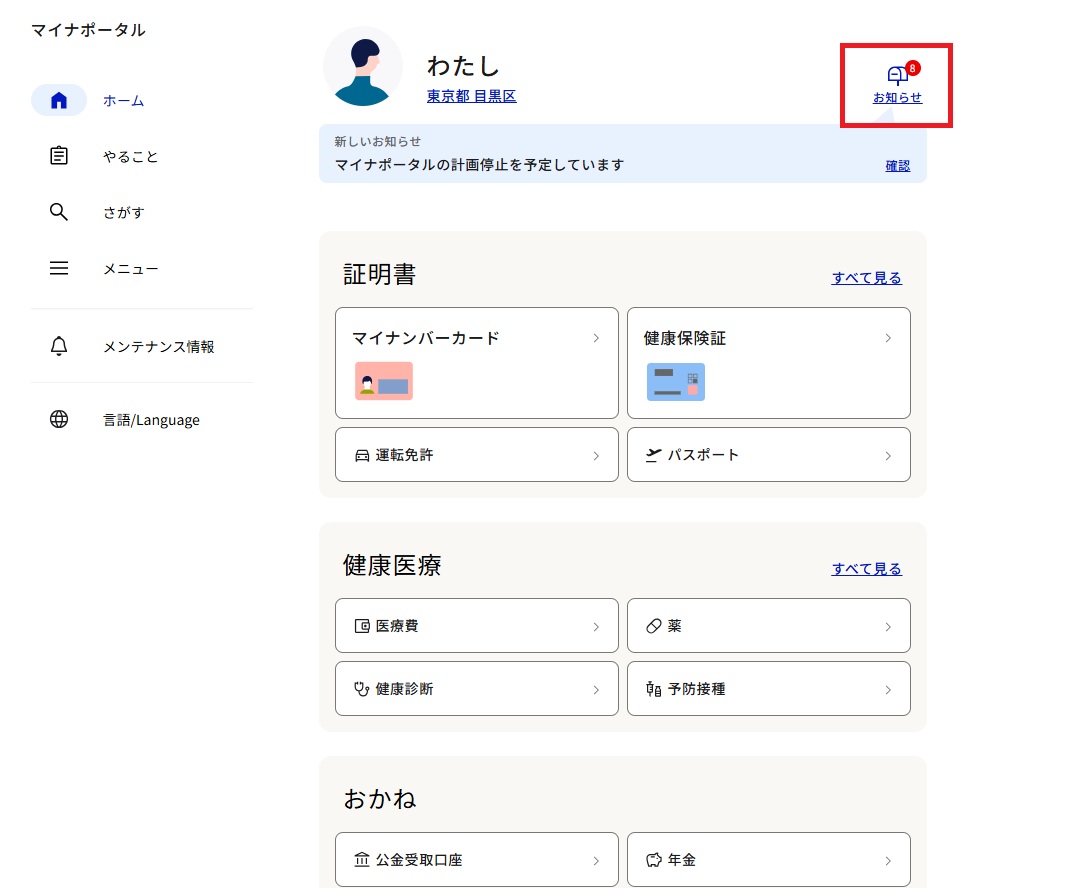 11)電子交付完了後、マイナポータルの「お知らせ」に通知が届きます。また、電子私書箱にも通知されます。
