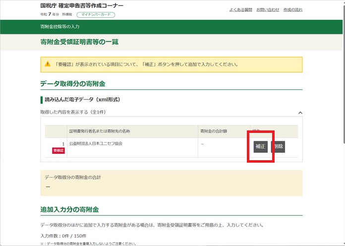 3)<寄付金控除証明等 読み込んだデータの「補正」作業について>