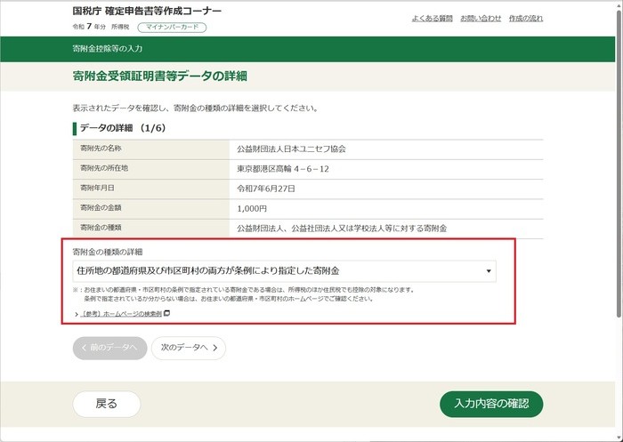 お住まいの都道府県および市区町村が「公益財団法人日本ユニセフ協会への寄附」を条例指定しているかにつき、こちらをご確認いただき、該当するものを選択ください。(内訳1件毎に選択いただく必要があります。)
