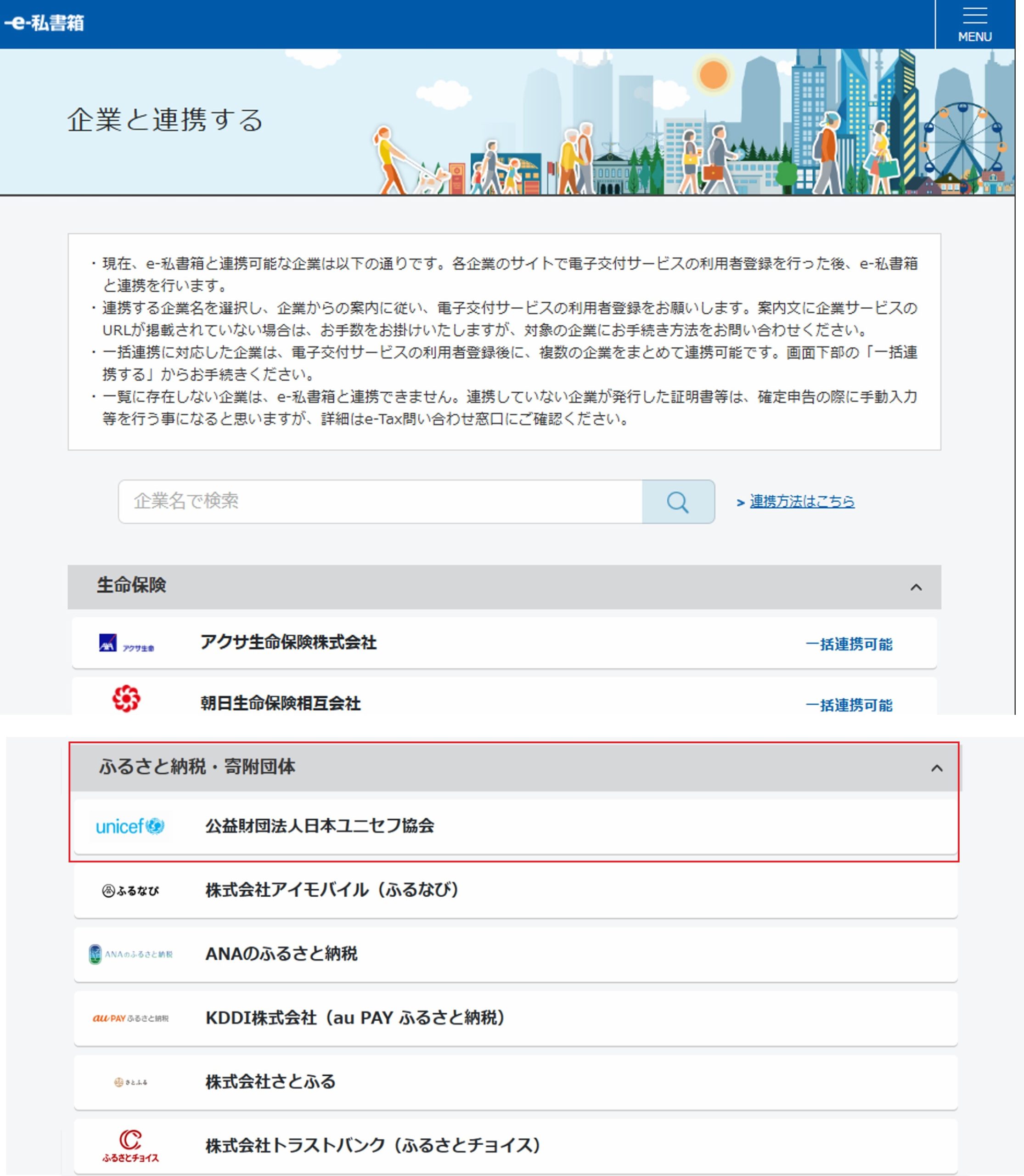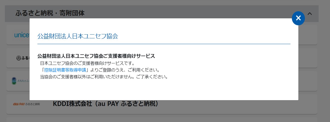 5)「企業名で検索」から「ユニセフ」で検索し、「ふるさと納税・寄附団体」カテゴリの「公益財団法人日本ユニセフ協会」を選択する