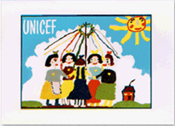 第二次世界大戦で荒廃したヨーロッパのとある村に住む7歳の少女イトカちゃんが、ユニセフの援助に感謝の気持ちを込めて描いた絵。この一枚の絵から、グリーティング・カードなどの「ユニセフ製品」を通じた世界の子どもたちへの支援活動が始まりました。 |