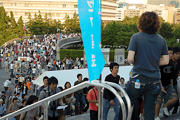 最初は、なかなか声の出なかった人たちも、時間とともに押し寄せるサッカーファンの前に、いつしか大声で協力を呼びかけていました。