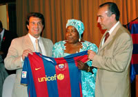 | スワジランドのコンスタンス・シメラネ副首相に、ユニセフロゴ入りのチームユニフォームを贈呈するFCバルセロナ会長ジョアン・ラポルタ氏(写真左)とラファエル・ユステ副会長(同右)。 |