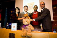 | 12月1日、“ドゥブ”を囲んで。左から:FCバルセロナ財団代表マルタ・セグ氏、FCバルセロナ会長のジョアン・ラボルタ氏、ユニセフのスーザン・カセデHIV/エイズ事業担当官、バプロ・ジメネズ-サィネス ユニセフ・スペイン国内委員会カタルーニャ事務所代表 |