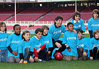 | このたびユニセフの親善大使に任命されたリオネル・メッシ選手。FC バルセロナサッカースクールの子どもたちと一緒に。 |