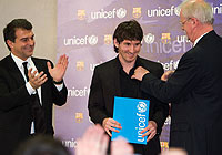 | ユニセフ民間協力渉外局のフィリップ・オブライエン局長から、ユニセフ親善大使に任命されるメッシ選手(中央)と拍手を贈るジョアン・ラポルタ FCバルセロナ会長(左)。 |