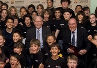 | FCバルセロナのマルク・バルトラ選手、ユニセフのアンソニー・レーク事務局長、FCバルセロナ基金のラモン・ポント副会長とバルセロナ市内の学校に通う子どもたち。 |