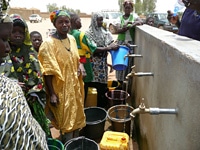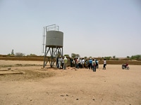 「1L for 10L」 の支援により2008年に導入されたゴロンボ村の小規模水道設備。ソーラーパネルのパワーで地下から汲み上げられた水は、地上約2メートルに設置されたタンクへと貯水され、水道設備の蛇口へと送られます。設備の周囲にはポリタンクやバケツを持った子どもや女性たちで常に賑わい、ゴロンボ村の人々の暮らしは活気と笑顔に溢れています。