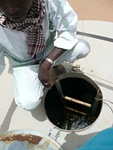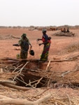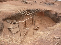 ひび割れた大地と潅木、時折遭遇する野生のラクダ以外目に入るのもは何もない。モプティを出発してから道なき道を走ること約4時間、ようやく辿り着いたトゥペレ村には、雨季に雨水を貯めるための大きな穴があちらこちらに掘られています。既に干上がってしまった穴が点在する中、蒸発を避けるために藁で覆われた数少ない穴から、村人は、雨季を前に残りわずかになった茶色い水をバケツで汲んで大切に家まで運びます。
