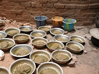 | 乾季も終わりに近づき、干上がってしまった穴 | 残り少なくなった茶色い水を汲む女性たち | 子どもたちの給食 すりつぶした豆や木の実でつくられている |