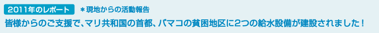 皆様からのご支援により、マリ共和国における衛生環境は少しずつ改善されています。しかし、バマコ周辺の一部の地域や農村部では、清潔で安全な水がなく、茶色く濁った水を利用して生活している村がまだたくさんあります。引き続き、皆様からのあたたかいご支援をよろしくおねがいします。