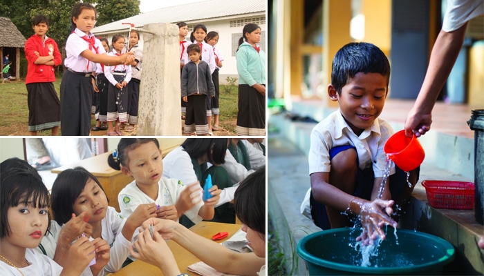 左上:©UNICEF Laos ラオスの子どもたちが新しく設置された水道設備で手を洗っている様子
