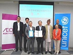 9月2日、ユニセフハウスにて、イオン1%クラブより仮設学校の建設支援金の贈呈式が行われました。これにより約50の仮設学校の建設、教材や備品の提供、子どもの心のケア等に関する教員への研修が行われます。