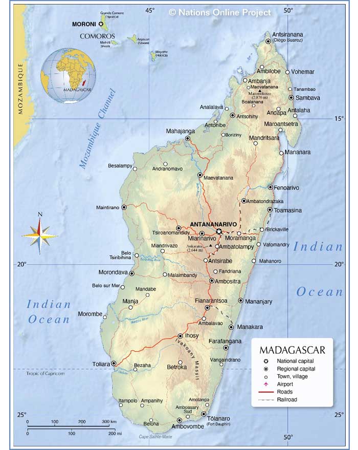 マダガスカル共和国は、アフリカ大陸の南東海岸部からおよそ400km離れたインド洋の沖合に浮かぶ、世界で4番目に大きな島国です。変化に富んだ気候風土で知られており、湿った貿易風の影響を受ける東部には熱帯雨林、首都アンタナナリボを含む中央部には標高1,000mを超える高地、雨季と乾季の差が大きい西側には乾燥林、雨量が極端に少ない南部には半砂漠地帯が広がっています。生息する動植物の約80%が固有種で、さらには石油、天然ガス、ニッケル、コバルトなどの天然資源も豊富です。