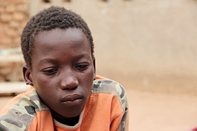 スーレマン君(14歳)は、2007年に軍隊に徴用され、2009年に支援を受けて復員しました。「内戦中、僕は東部の町に住んでいた。僕が暮らすコミュニティは孤立した。友だちから軍隊に行ったほうがいいと言われて、一緒にトラックに乗って軍隊のキャンプに入った。」まだ9歳だった彼は、10ヶ月の軍隊トレーニングを受けました。戦争について彼はこのように言っています。「死ぬ人や叫ぶ人、ケガをした人がいた。ケガをした人を治療するために医者も来ていた。とても怖かった。どうすることもできなかった。軍隊を離れることは不可能だった。」