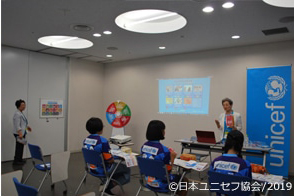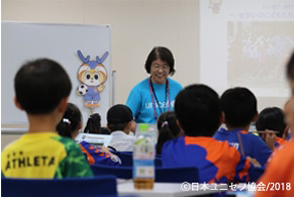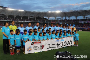 2018年8月15日には公式試合において「夏のV・ファーレン祭り 平和を願う子どもの日! ユニセフDAY」が開催され、スタジアム内外で様々なユニセフ活動が実施されました。スタジアム外周ではユニセフのブースが設置され、写真展やV・ファーレン長崎の選手のみなさまによる募金活動のほか、チャリティオークションにも多くのサポーターの方々が参加されました。同日は終戦記念日ということもあり、小学生と共に「世界の子どもたちと平和」を考える勉強部屋が設けられ、佐賀県ユニセフ協会が出前授業の特別講師を務めました。