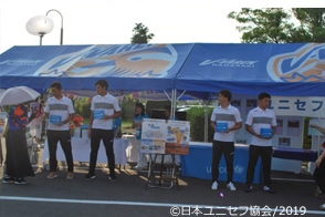 さらに支援の輪を広げるため、2019年8月17日にも公式試合において「ユニセフDAY」が開催され、ピッチ内イベント、支援先アフリカ・ケニアの子どもたちたちからのメッセージが展示された写真展、親子サッカー教室、久留米ユニセフ協会による授業など、様々な取り組みが行われ、未来を担う子どもたちのためにスポーツを通じた平和への取組みを伝える機会となりました。V・ファーレン長崎の選手のみなさま、クラブマスコットのヴィヴィくんによる募金活動も実施され、熱気あふれる多くのサッカーファンの方々からチームのユニセフ活動に協力が寄せられました。