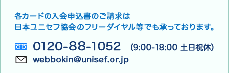 現在、「ユニセフVISAカード」と「ユニセフダイナースカード」が発行されており、「日本国内でのショッピングご利用金額の一部が、各カード会社よりユニセフ募金として本協会へ寄付されています。