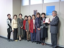 同社では、毎年10万ドルの支援のほか、新年会など折々の社内の催しでシュガーマザークラブが中心となり、募金を呼びかけています。贈呈式にユニセフハウスを訪れたシュガーマザークラブのみなさんは、2011年から2年間にわたって支援している、日本ユニセフ協会「東日本大震災緊急・復興支援」の活動報告を受け、現地で行われた活動や研修会の写真を見ながら、被災地の子どもたちやその家族の状況が少しずつ改善されてきていることを喜びました。